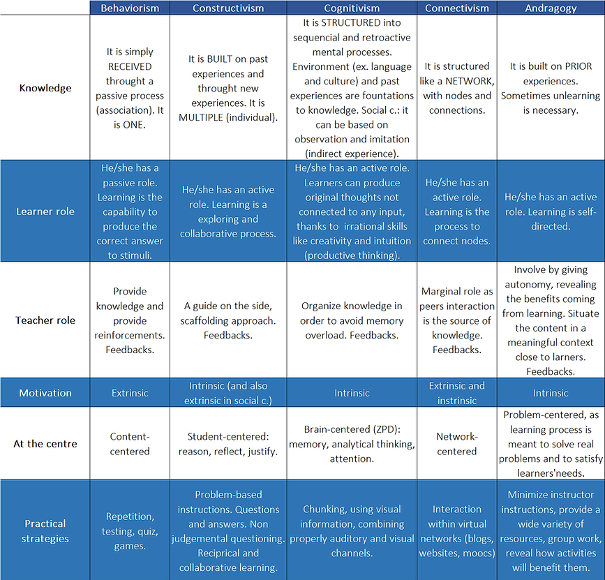 In this page I would like to give you an overview of the learning theories presented in this portfolio. My aim is to have a clear and quick summary in which you can see: